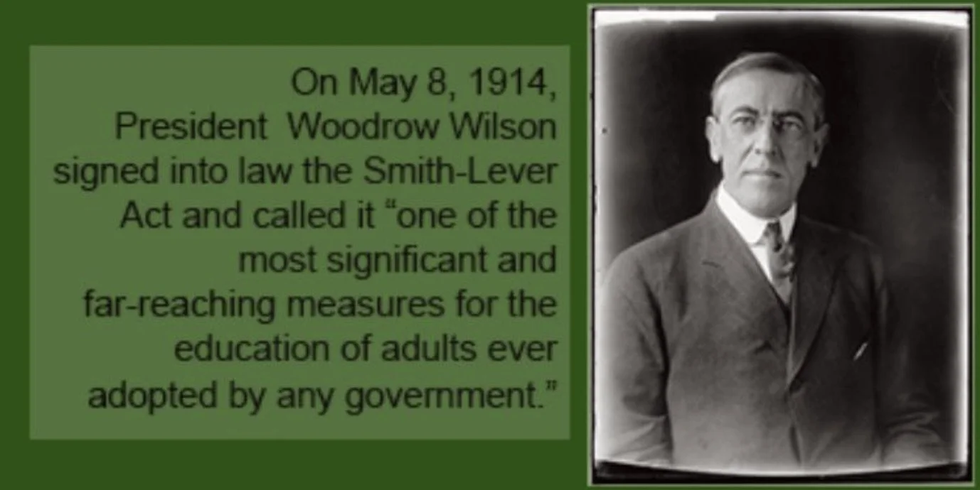 In 1914 Congress passed The Smith-Lever Act which was signed into law by President Woodrow Wilson. One of the goals of this act was to create a Cooperative Agricultural Extension whose purpose was to improve rural living as well as family and community life. In July 1915, Kankakee County hired an advisor to develop a home improvement association to meet this goal.